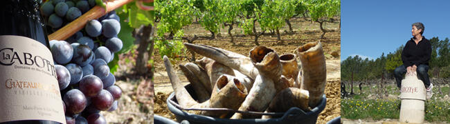 年間雨量の平均は300~350mm、多い年でも600~650mmと少ないエリア。ローヌの典型的な品種であるムールヴェードル、シラー、グルナッシュ、白はクレレット、ヴィオニエ、グルナッシュブランを栽培しています。ビオロジック農法を早い段階からはじめ、次第にビオディナミ農法へ転換。2005年には完全に切り替え、2010年にはデメテール認定を取得しました。ダイナミゼーションを行うための機械のプレパラシオンが当たる部分は全て木で作られており、樽の変形・水漏れを防ぐために水を入れ、ふたをして乾燥を防いでいるほど、ビオディナミへのこだわりを持っています。